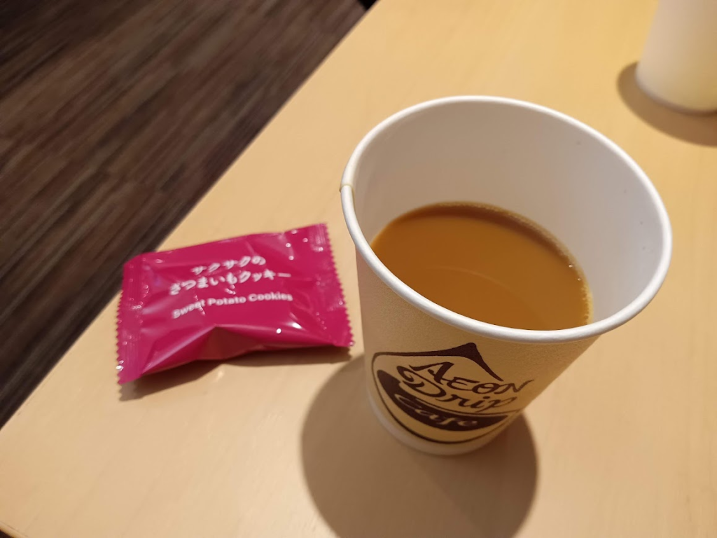イオンラウンジでは挽きたてコーヒー飲めますし、最近だとお菓子ももらえますね。ちなみにこの時いただいたさつもいもクッキーは家族が気に入り、イオンラウンジの後、イオンで買ってました。こういった出会いもいいですね!