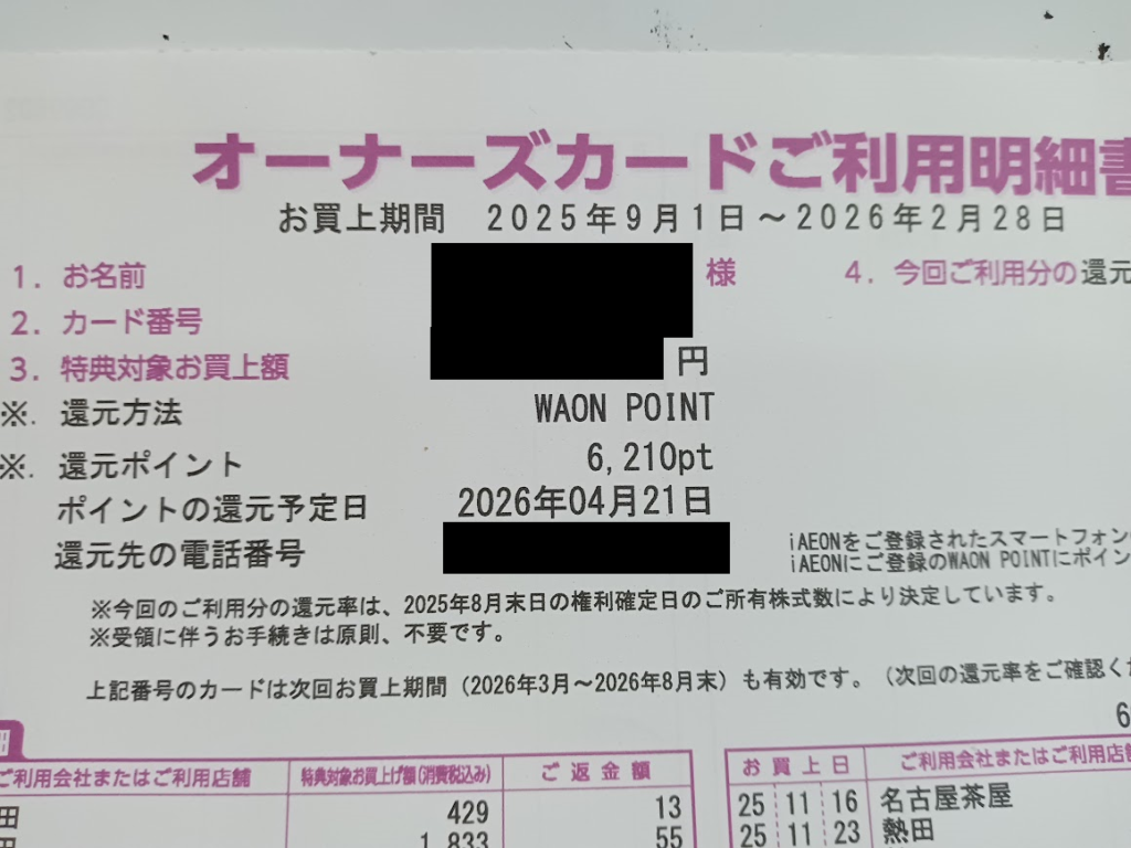 対象店舗でオーナーズカードを提示して買い物すると、半年ごとに利用金額に応じて現金、またはWAON POINTが返ってきます。