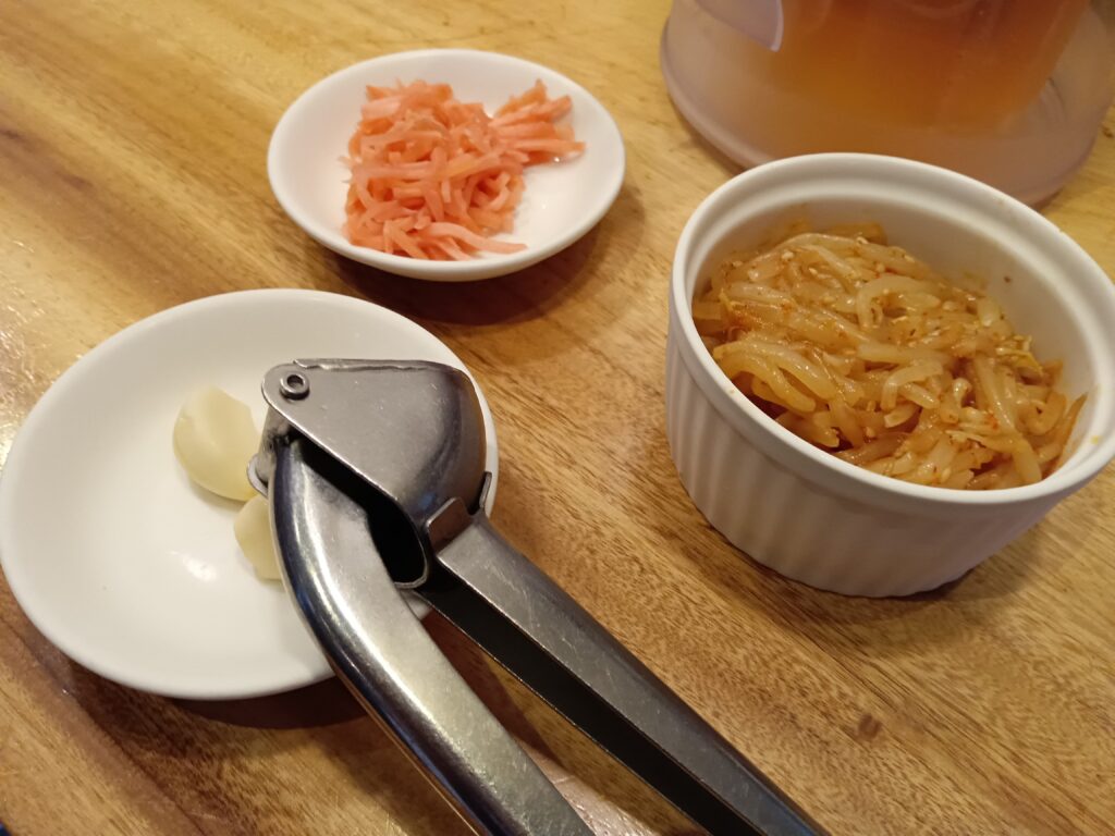 紅ショウガとニンニクは味変アイテムとなります。ニンニクは好き嫌いありそうですが、紅ショウガは試してみていただきたいです。